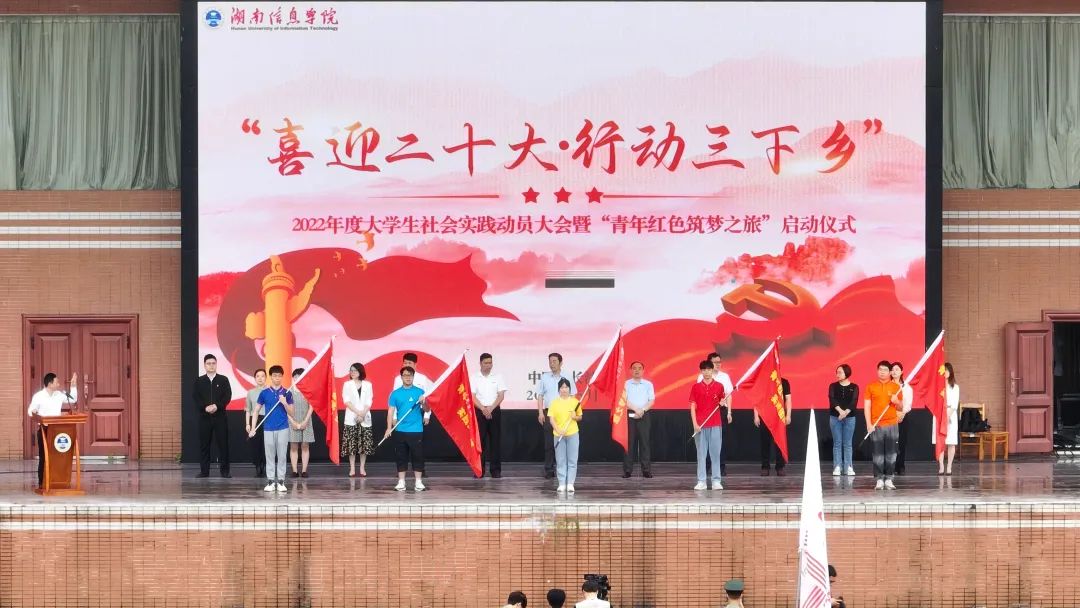 5月30日,湖南信息学院师生齐聚东院运动场,隆重举行2022年度大学生社会实践活动暨“青年红色筑梦之旅”启动仪式,校长黎大志为各社会实践代表队授旗,党委副书记姜佐澧作动员讲话,学生高唱《国歌》展示了湘信青年的青春热血。